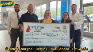 WE LOVE AND SUPPORT OUR TEACHERS —— Littleton Chevrolet’s $5000 Teacher Giveaway – At Littleton Chevrolet, we understand the commitment and dedication that all of our teachers in our community and beyond put into every single day, hour, minute and second to encourage their students to see those victories and to have them grow their confidence. On Saturday morning we had the pleasure to meet and congratulate this passionate young lady who stopped by to pick up her $1000 of Amazon Gift Cards. For 37 years and counting, Celine Leborgne of the Berlin Public School system has been getting up everyday during the school year and bringing her best effort to her 1st grade students. Graduating from Plymouth State College with a Bachelors degree in Education, Celine immediately started her teaching career in Berlin right after her diploma was inked. When asked what keeps her going after 37 years she answered, “Its the kids!! I love the kids. I love working towards seeing that light bulb turn on when my students finally get it after working through their struggles and work. I also absolutely love the hugs I get and give. It tells them that I am here for them and this is an awesome place to be. It is their safe place.” Every morning Celine has a meeting with the kids and she conducts an activity with them to get them moving and thinking. She also shares a message of the day that gives the students her expectations and what they will be working towards. It allows us to focus on the same thing throughout the day. Celine mentioned that this is her most challenging year. That doesn’t discourage her. She puts on that infectious smile and brings her best everyday with the students best interests in mind. Celine plans to share her winnings with her 1st grade team of teachers. She wants to purchase some easy reader books and additional supplies for her classroom and for the other teachers. One of those items was POST IT NOTES. She was told by her fellow colleagues that because she won the $1000 she can splurge on post it notes for the group. She laughed and told them that they should not worry. “I will buy post it notes for everyone.” Thank you Celine for all you do. It was our pleasure getting to know you and all you give back to your students and the Berlin Public School system. Enjoy your winnings and keep on being THE VERY BEST EVERYDAY. Everyone at Littleton Chevrolet is behind you. #weloveteachers