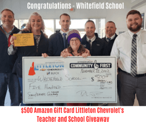 Wow, what amazing individuals and schools we have in the North Country. Their dedication and commitment to not only educate each and every child but to give them a chance to survive in our crazy world. On Saturday, November 19, we had the pleasure of welcoming our final winner in Littleton Chevrolet’s School and Teacher Giveaway, The Whitefield School in Whitefield, NH. There are some many incredible things happening at the school. We had the pleasure of chatting with Eileen and Dwight Armstrong to give us an update on what is happening this year. Eileen told us about all the wonderful goings on at the school. Not only do they teach but teach with the purpose. They have seen a significant growth in the students test scores after Covid. The students are more engaged and there are memorable connections between all the parties including the parents. They have adopted a process called “BE READY”. They take time to make sure that each student is ready everyday for the challenges of school and life. They make sure the students feel safe and secure. One awesome initiative they have been working on is with the NH Food Bank. They have developed a small food bank right in the school so that the students and/or the community has food at their fingertips. The staff continually connects with the students and families to make sure they have the nutrition to keep all going. What an incredible program!!! They have also created a WELLNESS CENTER five years ago. This safe space allows counselors to address a child’s demeanor or an outburst in the classroom in order to get them READY or stay READY throughout the day. Its a quiet space to work on the problem or they just might need some time to relax and work with some special breathing techniques for better focus. It also can be used as a social or emotional learning space. Boy is this school have it together and their resilience is off the charts. Another forward thinking approach they have adopted is the creation of a CTE (Career and Technical Education) program for 7th and 8th graders. These students have an opportunity to go hands on with skills like welding, maple syrup making, criminal justice, hospitality, and flower arranging to name a few. Talking about getting them ready early. This surely exposes each student to a variety of skills and jobs to better position themselves for a career after high school. When asked what the school was going to do with the $500.00 Amazon Gift Card they won, Eileen said that the staff and teachers are all working closely with Principal, Michael Cronin to see what is best direction to go that will benefit the school and the students. Everyone at Littleton Chevrolet is so very proud of compassionate and forward thinking staff at the Whitefield School. Wishing all of you the best for a great finish to the year and a wonderful holiday season.